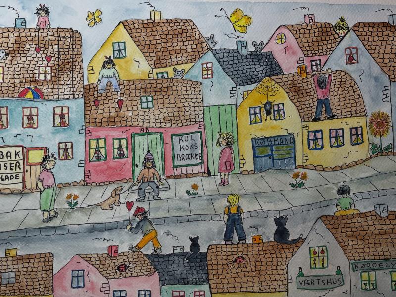 Ulla Rasmussens serie af naivistiske billeder beskriver med fantasi livet i et lille samfund. De er tegnet med blyant og tusch og malet med akvarel.